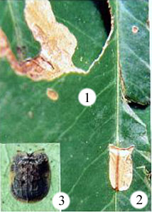 Biology 1 - larval mine, 2 - pupal mine, 3 - mature beetle, (by courtessy of Dr. H.V. Ghate)
